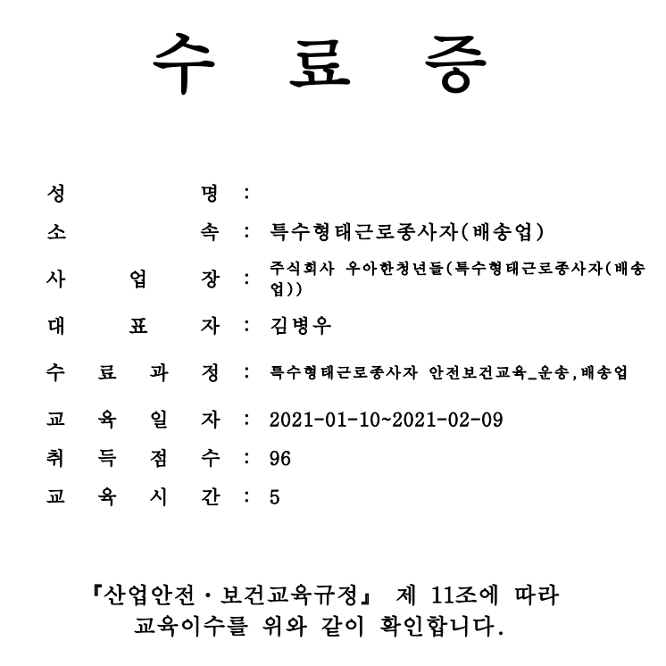 도보로 배달 하더라도 산업안전교육을 들어야 한다. 코로나 이전에는 센터에 가서 강의를 들었던 것 같은데, 언텍트 시대에 맞춰 요즘은 pc교육으로 대체되니 너무 편하다. 편한 시간에 pc로 교육받고 수료증을 받으면 1-2일 내에 자동으로 운행 가능 문자가 오고 그때부터 배민 라이더스 앱을 통해서 활동이 시작 가능하다.